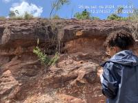 Afloramento de aproximadamente 200 m, da Formação Sergi representando a fase pré-rifte com fácies eólica com arenitos caulinizados demonstrando clima áridoem canais amalgamados entrelaçados sob a facies fluvial com arenitos de retrabalhamento eólico e estratificações cruzadas