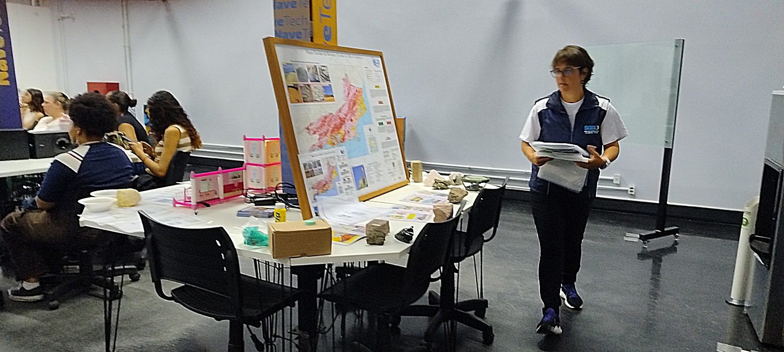 A segunda ação do sábado (25) na capital fluminense foi a oficina "Geologia Histórico-Crítica" em parceria com a Universidade Federal do Estado do Rio de Janeiro (UNIRIO), na Nave do Conhecimento de Engenho de Dentro. Na ação, os alunos da professora Rosimeri Pereira da Silva aprenderam a identificar os recursos minerais que fazem parte do seu dia a dia e conheceram os recursos didáticos produzidos pela equipe do SGBeduca, como livros e cartilhas, a exemplo das obras "Dr Pedrosa e Dra Rocha no mundo dos minerais e das rochas" e "Raquel e as Rochas", além do Mapa Escolar de Rochas do Estado do Rio de Janeiro. Todos os materiais estão disponíveis no site sgbeduca.sgb.gov.br