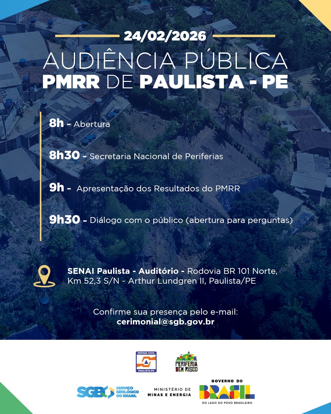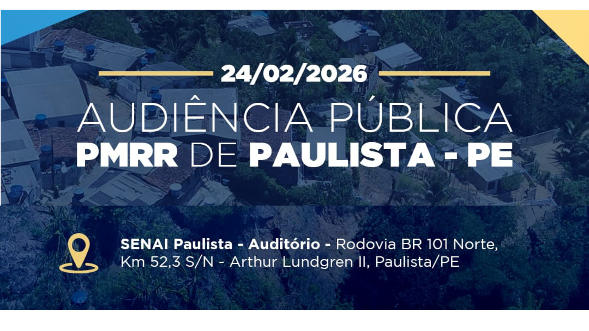 Paulista (PE) – O governo federal realiza as etapas finais para entrega do Plano Municipal de Redução de Riscos (PMRR) do município do Paulista (PE). Nesta segunda-feira (23), será realizada capacitação técnica dos agentes municipais e, em seguida, na terça-feira (24), às 8h, o PMRR será apresentado à população em audiência pública, no Senai Paulista. Na ocasião, serão divulgados os resultados do mapeamento das áreas de risco e as propostas técnicas de intervenções.