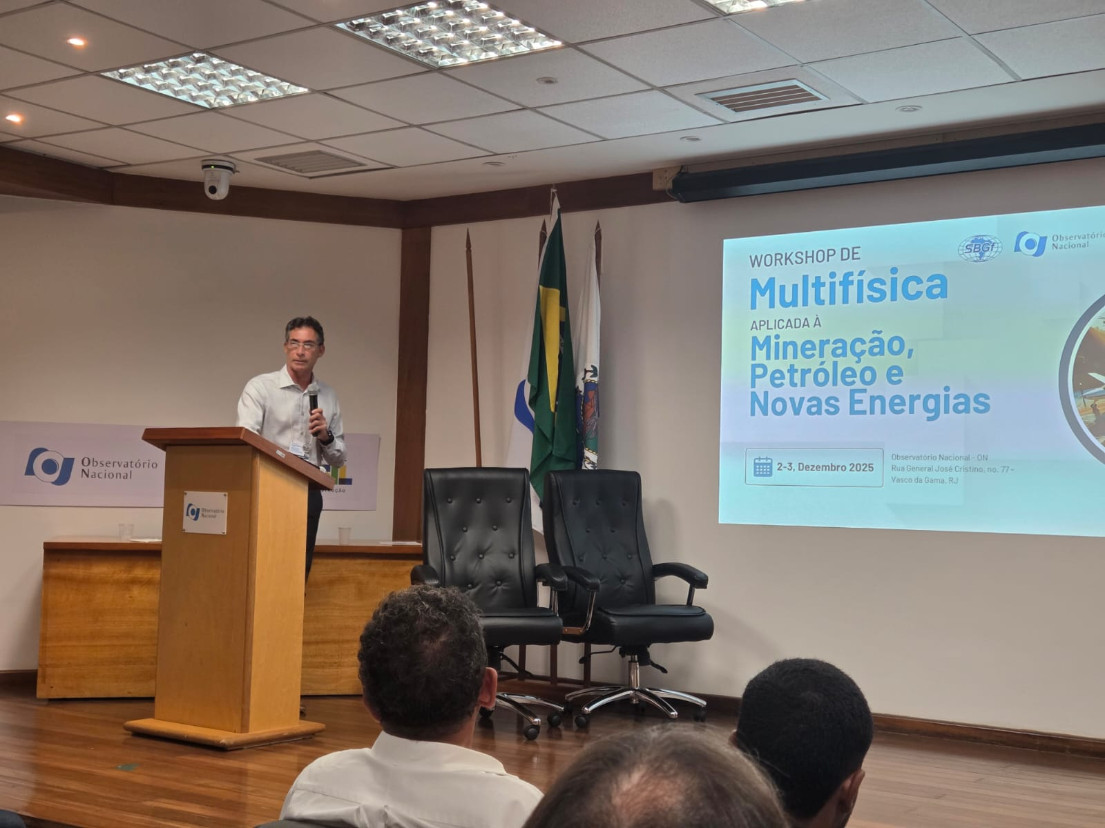 Rio de Janeiro (RJ) – Pesquisas geofísicas do Serviço Geológico do Brasil (SGB) ganharam destaque durante o Workshop de Multifísica Aplicada à Mineração, Petróleo e Novas Energias, realizado entre 2 e 3 de dezembro, no Observatório Nacional, Rio de Janeiro (RJ). O SGB foi representado no evento pelos pesquisadores Iago Costa, chefe da Divisão de Sensoriamento Remoto e Geofísica (DISEGE) da Diretoria de Geologia e Recursos Minerais (DGM); Elias Prado, coordenador Executivo do Centro de Geociências Aplicadas do SGB (CGA) e Oderson Souza Filho, pesquisador do CGA.