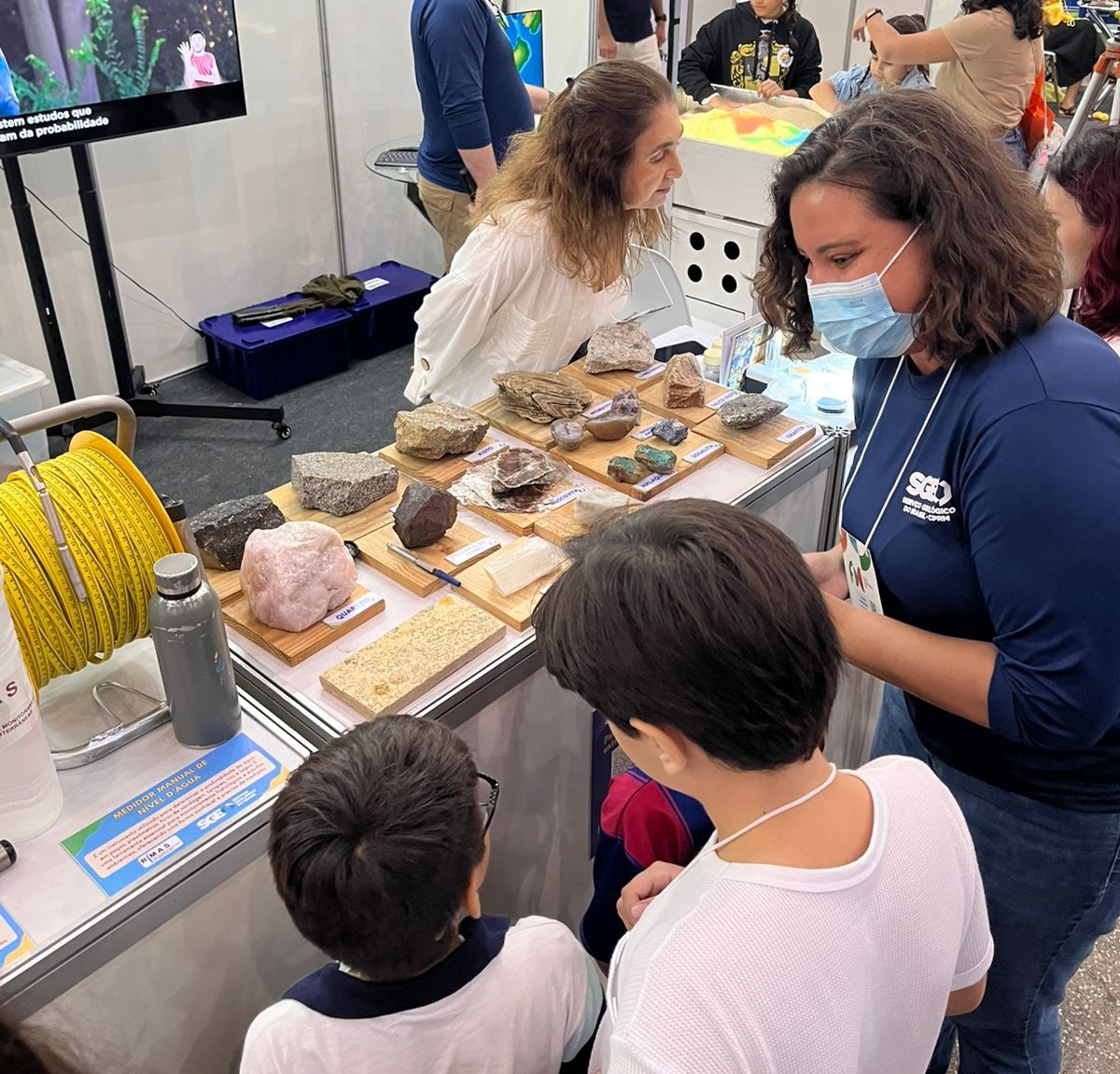 Além disso, a tradicional exposição de rochas, minerais, além de brindes e materiais educativos foram amplamente distribuídos, incluindo réplicas de fósseis, tabletes de rochas, cartilhas do SGBEduca, cards informativos e até amostras de rochas do fundo oceânico do Projeto Fosforita.