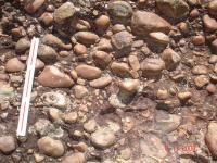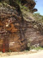 | The lithologies present in the outcrop are: conglomerate supported by the clasts and by the matrix (alluvial fan), that occurs in the south margin of the highway, with access through a gate, and passing through an abandoned house; sandstone with fluted cross strata, poorly selected (fluvial system) and well selected sandstone, bimodal, with plane-parallel stratification and large grooved criss-cross (wind system). These lithologies characterize a perfectly preserved paleo-desert. Regionally the eolian sandstones are, explored as slabs for the flooring of floors. At the current level of knowledge, this is the only outcropping on the Tombador Escarpment, which has a record of alluvial fans. In addition to its high scientific value, this geosite has educational use of national relevance with low risk of degradation. |