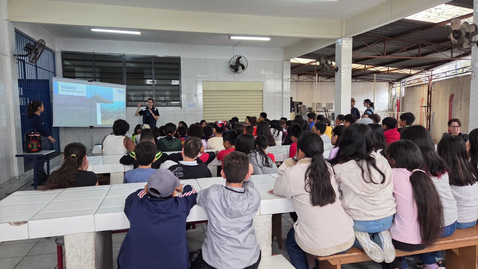 No dia 16 de setembro, em São Paulo (SP), o SGB, em parceria com Instituto de Geociências da Universidade de São Paulo (IGC-USP), promoveu atividades para mais de 150 alunos do 6º ano da Escola Estadual Domingos Faustino Sarmiento. Organizada pelo SGBeduca, a programação contou com uma palestra sobre fósseis, a evolução da vida e a história das extinções, ministrada pelo geólogo do SGB Francisco Campos. Em seguida, os jovens puderam participar de oficinas, coordenadas pelas técnicas do SGB, Eliane Moreira e Juliana Lourenção, quando puderam manusear algumas amostras de fósseis.