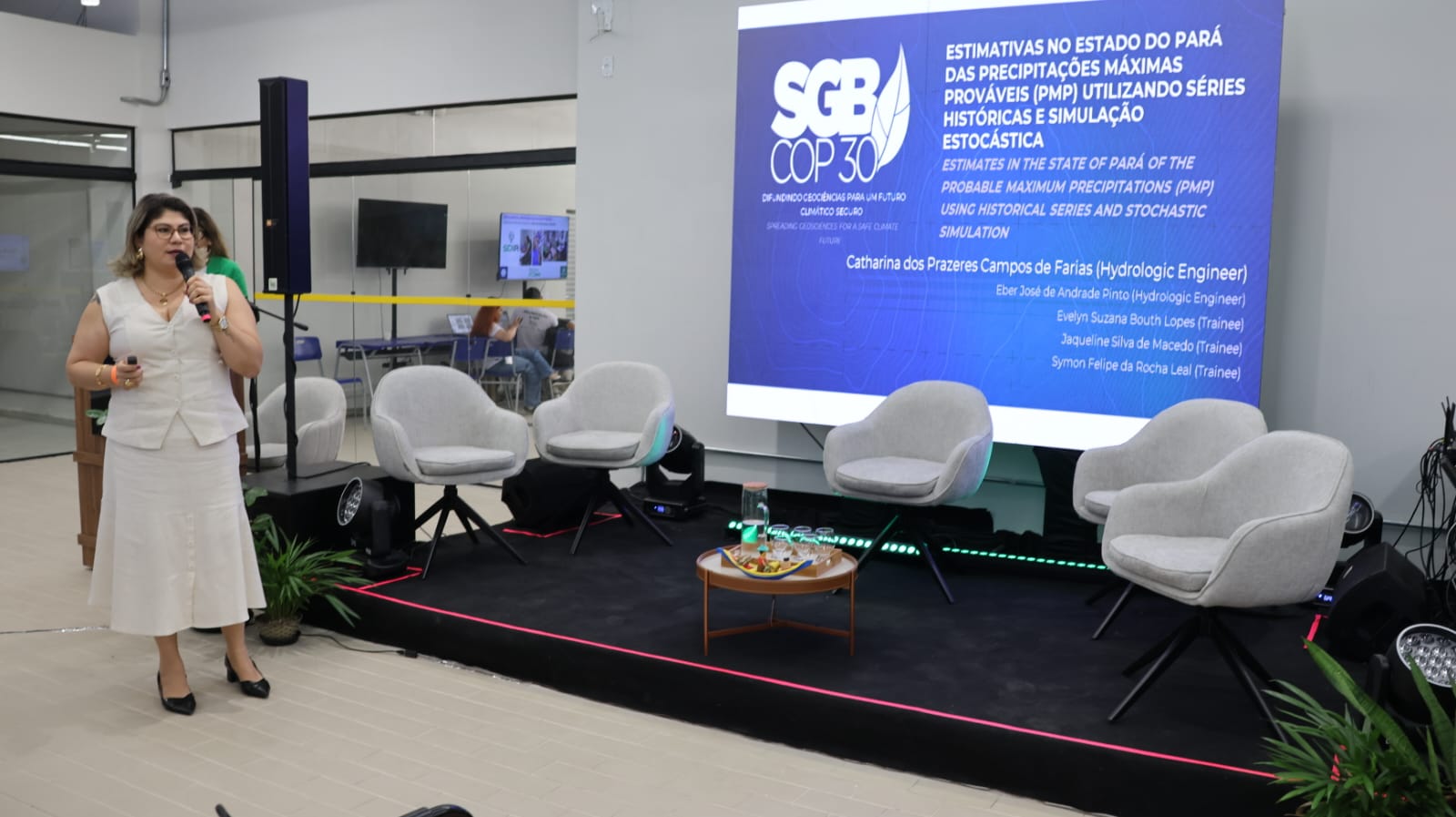 Na sequência, a pesquisadora Catharina Campos apresentou o estudo “Estimativas no Estado do Pará das Precipitações Máximas Prováveis (PMP) Utilizando Séries Históricas e Simulação Estocástica”. A pesquisa analisou dados de 97 estações pluviométricas do Pará, com séries históricas entre 30 e 60 anos, para estimar as chuvas extremas que podem ocorrer no estado.