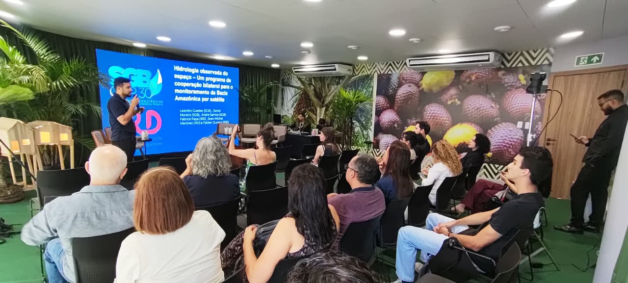 O pesquisador Leandro Guedes Santos apresentou, na Zona Verde, o painel “Hidrologia Observada do Espaço: Um Programa de Cooperação Bilateral para o Monitoramento da Bacia Amazônica por Satélite”. Na Tech Zone, a palestra foi ministrada pelo pesquisador Daniel Moreira.