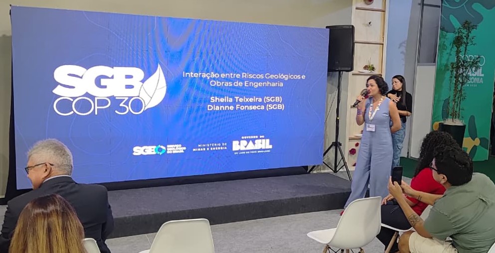 Belém (PA) - Em mais uma participação de destaque na COP30, o Serviço Geológico do Brasil (SGB) exibiu o painel “Interação entre Riscos Geológicos e Obras de Engenharia”, nesta terça-feira (18), no Espaço CREA-PA, na Zona Verde. A apresentação foi conduzida pelas geólogas do SGB, Sheila Teixeira e Dianne Fonseca.