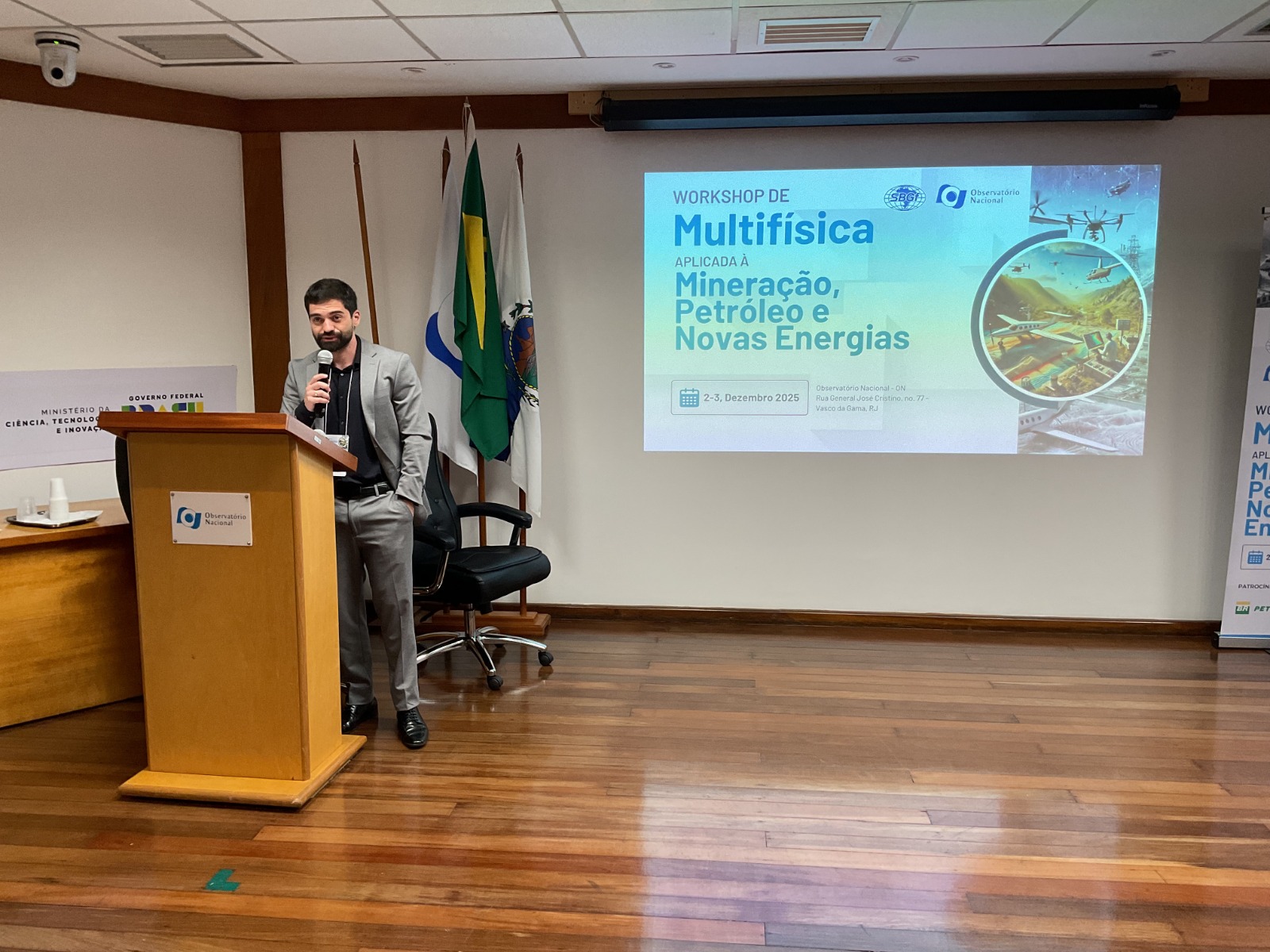 Rio de Janeiro (RJ) – Pesquisas geofísicas do Serviço Geológico do Brasil (SGB) ganharam destaque durante o Workshop de Multifísica Aplicada à Mineração, Petróleo e Novas Energias, realizado entre 2 e 3 de dezembro, no Observatório Nacional, Rio de Janeiro (RJ). O SGB foi representado no evento pelos pesquisadores Iago Costa, chefe da Divisão de Sensoriamento Remoto e Geofísica (DISEGE) da Diretoria de Geologia e Recursos Minerais (DGM); Elias Prado, coordenador Executivo do Centro de Geociências Aplicadas do SGB (CGA) e Oderson Souza Filho, pesquisador do CGA.