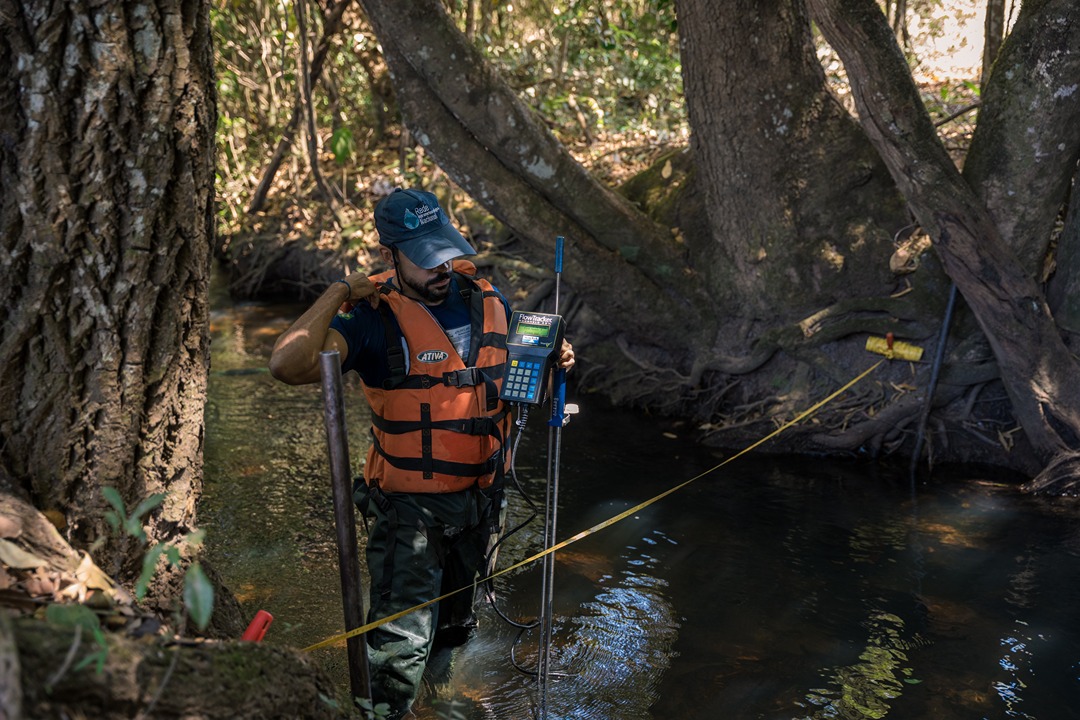 - Medições em campo (vazão, sedimentos e parâmetros de qualidade da água), incluindo nivelamento de réguas limnimétricas e levantamento de seções transversais;