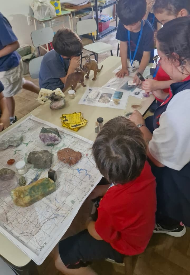 Para levar conhecimento às crianças, no dia 16, foi realizada uma atividade de popularização das geociências na Escola de Educação Infantil Voando Alto, em Porto Alegre (RS). A geóloga Daiane Hammes levou um acervo de minerais, rochas, fósseis e amostras de areias de diferentes partes do mundo para uma aula prática e lúdica. A atividade permitiu que os alunos observassem os materiais com lupas, despertando a curiosidade científica e conversando sobre a origem e a formação desses elementos naturais, uma rica experiência sensorial e investigativa.