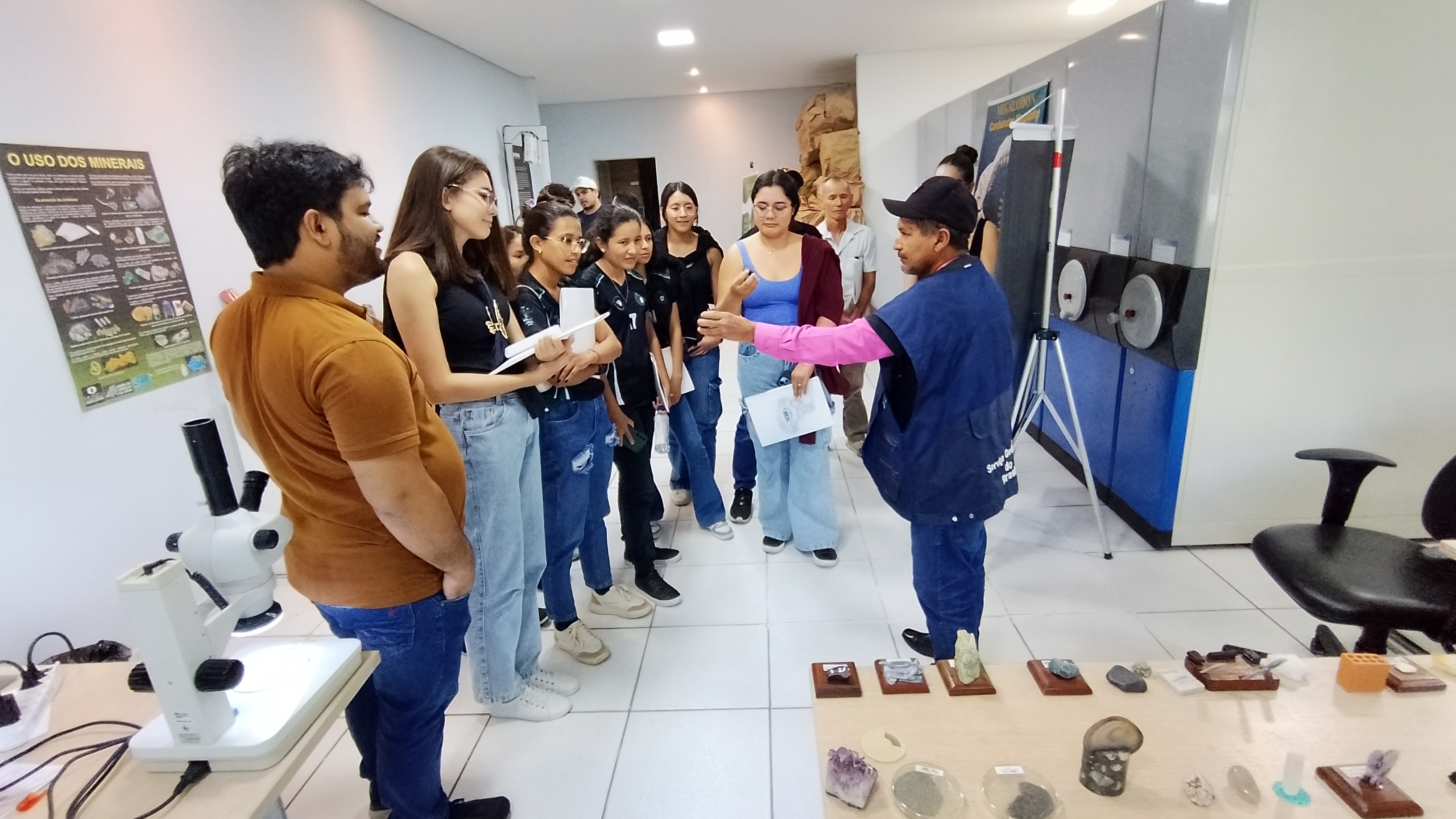Na oportunidade, também visitaram o acervo da superintendência, em uma verdadeira imersão técnica, vivenciando na prática o ambiente profissional onde podem atuar no futuro. A combinação entre palestra especializada, contato direto com amostras geológicas representativas do estado e o acesso às instalações do SGB ofereceu uma experiência única de aprendizado além da sala de aula.