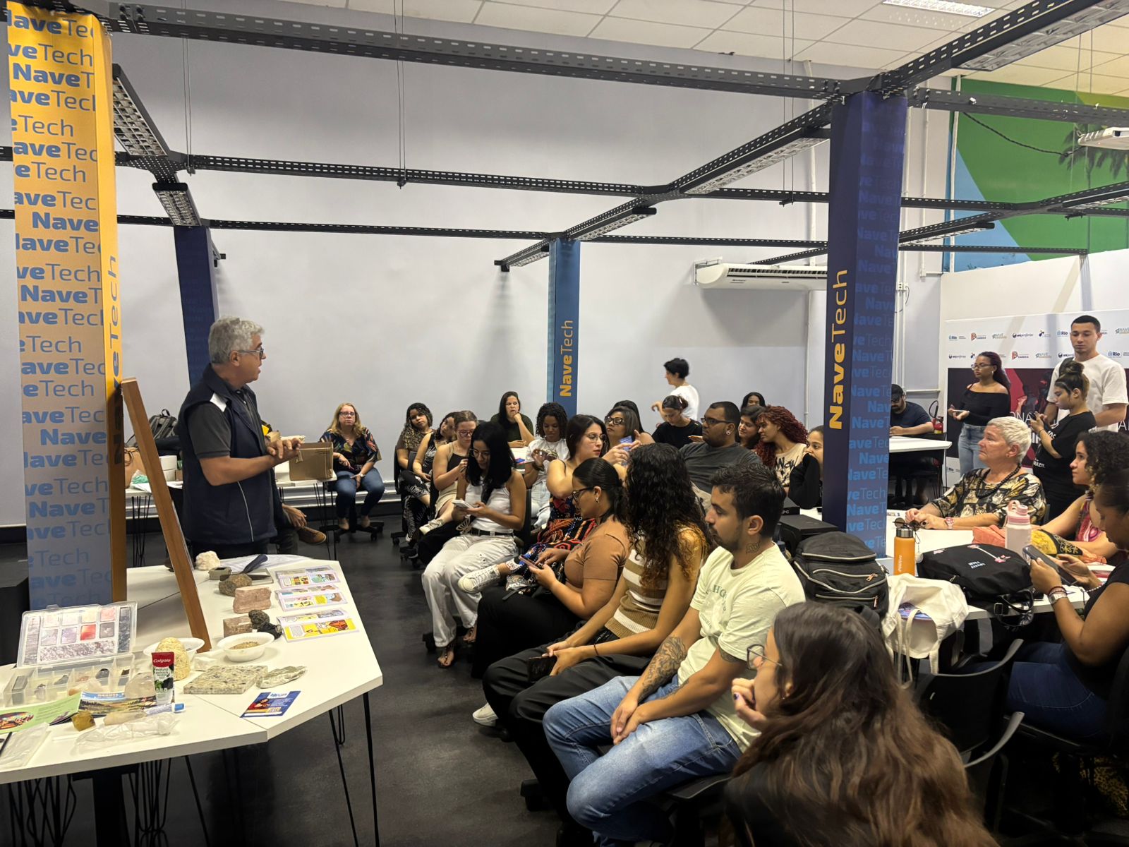 A segunda ação do sábado (25) na capital fluminense foi a oficina "Geologia Histórico-Crítica" em parceria com a Universidade Federal do Estado do Rio de Janeiro (UNIRIO), na Nave do Conhecimento de Engenho de Dentro. Na ação, os alunos da professora Rosimeri Pereira da Silva aprenderam a identificar os recursos minerais que fazem parte do seu dia a dia e conheceram os recursos didáticos produzidos pela equipe do SGBeduca, como livros e cartilhas, a exemplo das obras "Dr Pedrosa e Dra Rocha no mundo dos minerais e das rochas" e "Raquel e as Rochas", além do Mapa Escolar de Rochas do Estado do Rio de Janeiro. Todos os materiais estão disponíveis no site sgbeduca.sgb.gov.br.